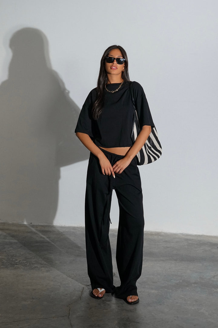 חולצת אוברסייז שרוולים קצרים | מכנסיים ארוכים בגדרה ישירה עם גומן במותן ושרוכי קשירה