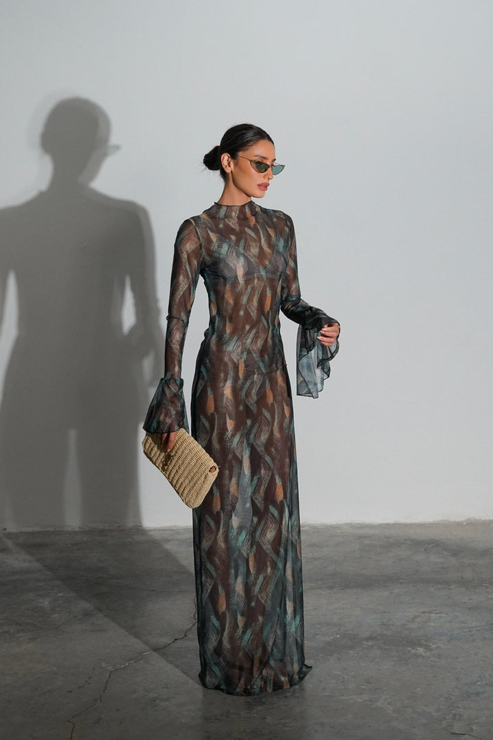 | שמלת מקסי פרינט צבעוני בד רזיל | שרוולים ארוכים סיומת פעמון |